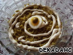 Одно яйцо разрезать яйцерезкой на кружочки, 6 средних, ровненьких отложить для украшения. Еще из одного яйца вырезать зубчиками цветочек. Остальное натереть на крупной терке на салат и равномерно распределить. Сверху снова нанести сеточку из майонеза.