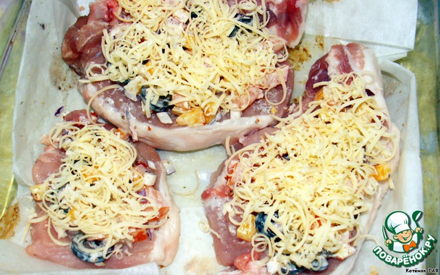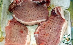 Корейку немного отбить. У меня были ОЧЕНЬ толстые куски. Пришлось отбить немного, да ещё и сверху немного майонеза, чтобы не было сухим мясо.