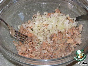 Размять рыбные консервы вилкой, не сливая жидкости, и добавить лук.