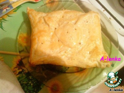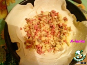 Вариант начинки. Жило-было тесто слоеное бездрожжевое. Жило оно в морозилке, и стало ему скучно. Решило оно выйти в свет, показать себя во всей красе, да и погреться заодно. А чтобы не было совсем скучно, позвало тесто своих друзей: картошку, колбаску и шампиньоны. И отправились они в долгое путешествие...