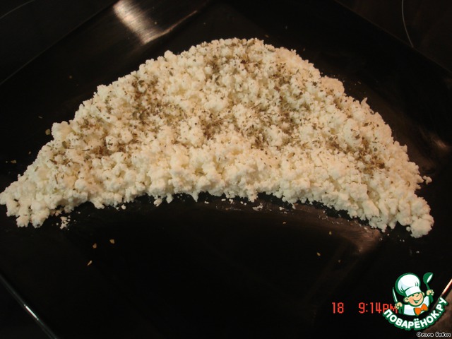 Фету трем на терке и укладываем в форме дольки, присыпаем душицей.