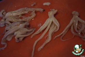 Осьминогов разморозить (счастливым обладателям свежих осьминогов ничего не делать!). Парочку красивых отложить.