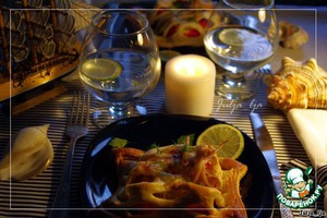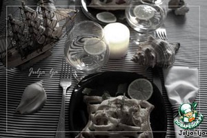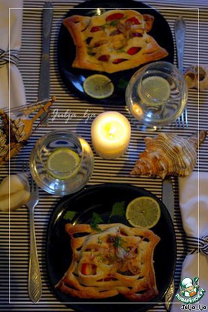 Какой мужчина не любит рыбалку? Правильно - редкий! Вот и мой... Заядлый... А какой мужчина, любитель рыбалки, не мечтает о настоящей морской рыбалке? Правильно - редкий! Вот и мой... Мечтает... Приближаем мечту и готовим нежнейший жюльен с морскими жителями - осьминожками, помещаем его в лодочку из сочного перца и накрываем всe рыбацкой сетью из хрустящего слоeного теста. Стол накрываем в морском стиле и... Зовeм любимого рыбака-моряка! На конкурс "Подари мне этот вечер".