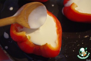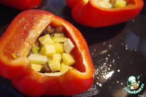 Далее сыр нарезаем кубиками. Кладём в перцы.