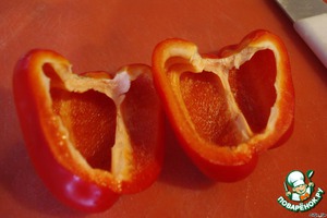 Перчик разрезаем вдоль, вынимаем сердцевинку. В процессе приготовления я поняла, что и начинки у меня на три половинки перца, да и муж вряд ли наестся одной половинкой. Поэтому порций у меня 3, но кушали мы вдвоём (муж ещё и на мою порцию посягал, когда понял, как это вкусно).