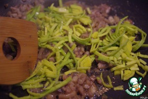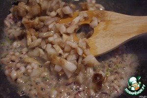Добавляем нарезанные шампиньоны. Обжариваем ещё 2 минутки.
