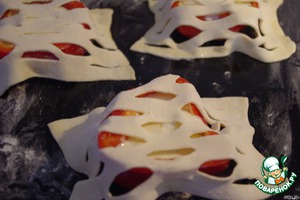 Перцы выкладываем на противень (его можно немного смазать оливковым маслом). Накрываем "сетью" из теста.