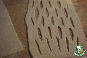 Тесто раскатываем тонко, разрезаем на три части. И для того, чтобы получилась сетка, делаем надрезы по такой схеме. Первый ряд, потом отступаем место делаем третий ряд, на уровне с первым, а второй, между ними. Надеюсь, понятно.