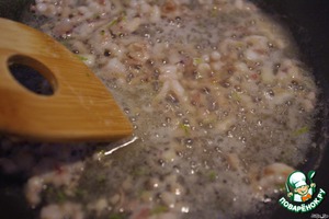 И лук-порей. Обжариваем минутку, солим и перчим - по вкусу. Соль здесь лучше использовать морскую, а перец - свежемолотый. Эх... Но я использовала.. Так правда вкуснее!