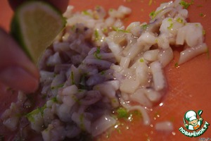 Нарезать основную массу осьминогов мелко. С лайма снять цедру. Посыпать. Полить соком лайма. Оставить на 10 минут - мариноваться.