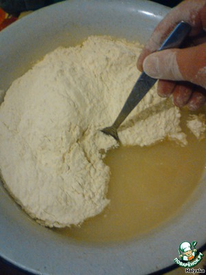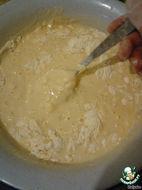 Всыпаем муку и начинаем интенсивно работать ложкой.