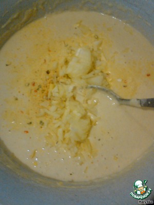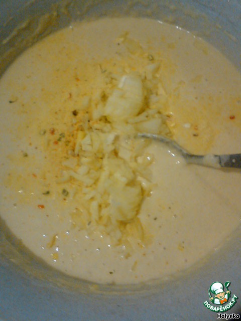 Дабавляем лук, перец и приправку в тесто. Все хорошо вымешиваем. Тесто густоватой блинно-оладной консистенции. Ставим миску в теплое место и ждем, когда тесто запузырится и подрастет.