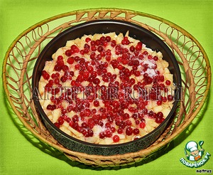 Дно формы для выпекания обязательно смазать сливочным маслом и посыпать панировочными сухарями. Затем в форму выкладываем тесто, поверх ровным слоем распределяем нарезку из яблок, посыпаем брусникой и оставшимся сахаром. Ставим в разогретую до 150 град. духовку на 30 минут.