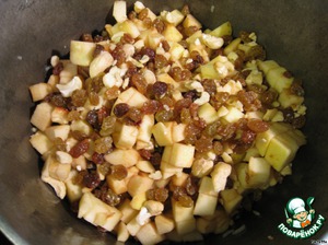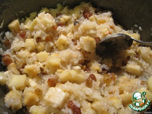 Снимаем половину риса. Выкладываем яблоки, орехи и изюм.