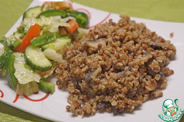 Лук и чеснок нарезать. Обжарить в смеси сливочного и оливкового масла до прозрачности. Добавить грибы, посолить, поперчить. Через 2 минуты всыпать гречку.