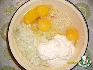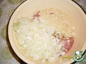 Посолить, поперчить. Хорошо вымесить и оставить на часок, чтобы вермишель набухла. Добавить муку. Перемешать.