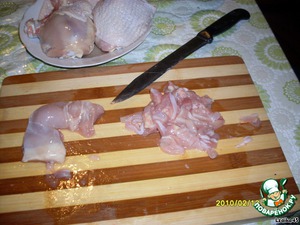 С куриных бедрышек снять кожу, вырезать косточки. (Это пойдет в бульончик.)