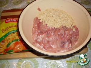 Вермишель быстрого приготовления измельчить и добавить к мясу.