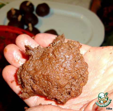 Форма картошки круглая (росточки - из творога и вафель с добавлением холодного молока). Теперь надо поставить в холодильник.