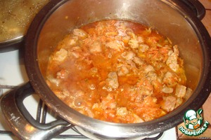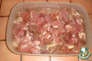3. Добавляем к овощам индейку, предварительно замаринованную в полусладком белом вине, порезанную на кусочки диаметром примерно 2 см.