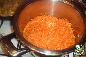 2. Добавляем к луку морковь, измельченную на крупной терке. Жарим на большом огне пару минут.