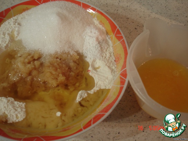 Смешать сахар, муку, соду, разрыхлитель, растительное масло, сок апельсиновый,