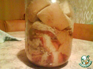Этой смесью натереть сало и плотно уложить его в банку. Закрутить под железную крышку, перевернуть вверх дном и забыть на две недели. -