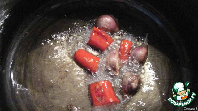 Включаем огонь на всю и первыми у меня пошли чеснок и перец. Красиво! А какой пошел аромат!!!