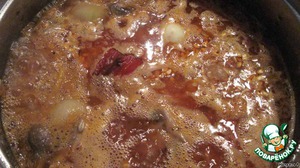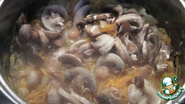 Теперь самое время положить свиные ребрышки и копченую грудинку, но я положила обжариваться грибы. Не забываем периодически перемешивать перловочку!