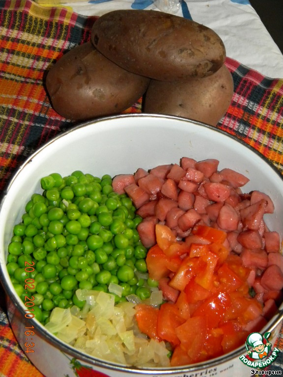 Горошек отварить 4 мин. в подсоленной воде. Слить.
