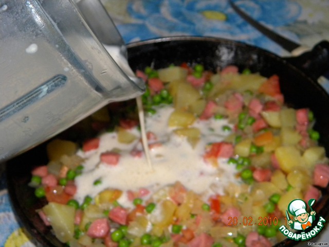 Взбить яйца с молоком + соль, перец (если есть, добавить зелень) + натертый сыр.