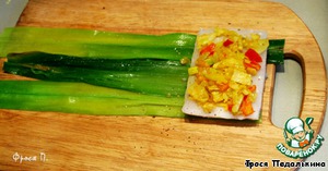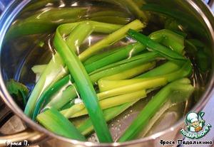 Зеленую часть лука-порея опустить в кипящую воду на 2 минуты, затем откинуть на дуршлаг и опустить в холодную воду. Так листья сохранят свой яркий цвет.