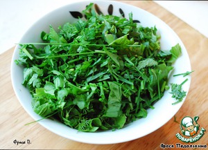 Зелень вымыть, высушить, мелко порубить, оставив пару веточек для украшения.