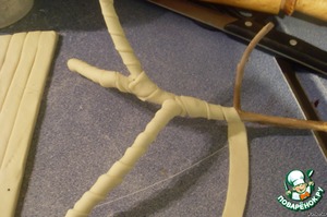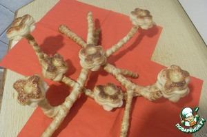 В местах где должны быть цветы в тесто вставляем половинки зубочисток. Тесто смазываем яйцом и посыпаем сахаром.