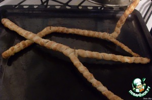 Тесто уже размороженное (можно замесить любое дрожжевое) примерно половину раскатываем и режем на полоски шириной 1см.