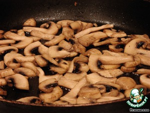 • На сковороде нагреваем оливковое масло и растапливаем в нем сливочное. Выкладываем грибы и поджариваем на среднем огне до мягкости и коричневатого цвета. Снимаем сковороду с огня.