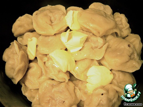• Отвариваем наши пельмешки 7-10 минут и, переложив их в жаропрочную посуду, перемешиваем с кусочками сливочного масла.