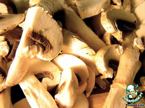 • А теперь займемся соусом. Грибочки моем и нарезаем тонкими пластинками.