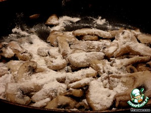 • В сковороду с грибами добавляем муку.
