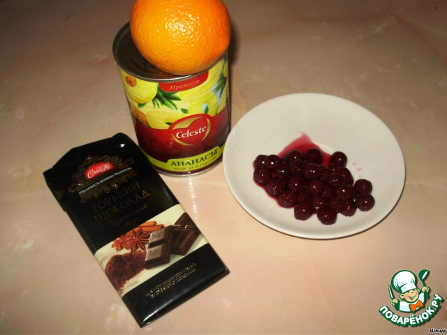 Фрукты подготовленные нарезаем дольками, укладываем бокал слоями, сверху украшаем вишней и долькой шоколада. По желанию можно добавить сироп ананаса, или взбитые сливки.