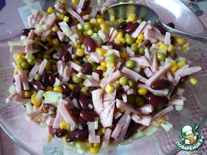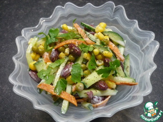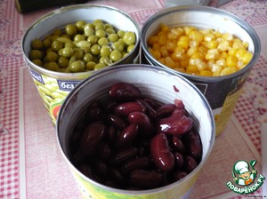 Берем кукурузу, горошек, фасоль и выкладываем в салатник.