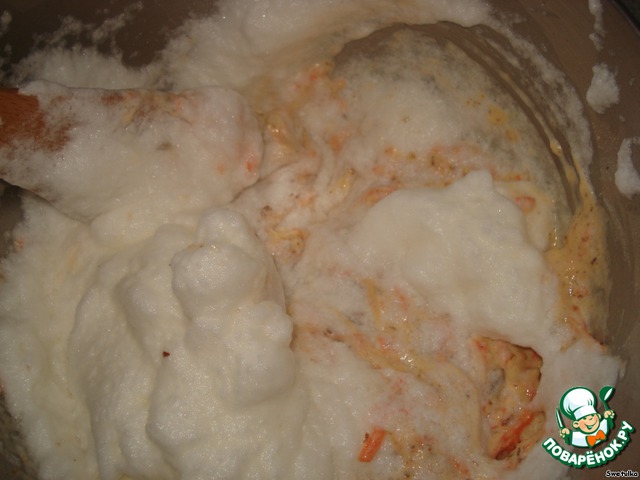 1. Морковь натереть на мелкой тёрке. Отделить желтки от белков. Желтки, сахар и воду хорошо взбить.