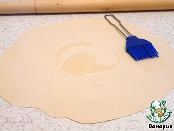 Тесто для удобства делим на 2 части. Oдну накрываем полотенцем и откладываем, а вторую раскатываем в тонкий пласт, смазываем растительным маслом и сворачиваем в рулет.