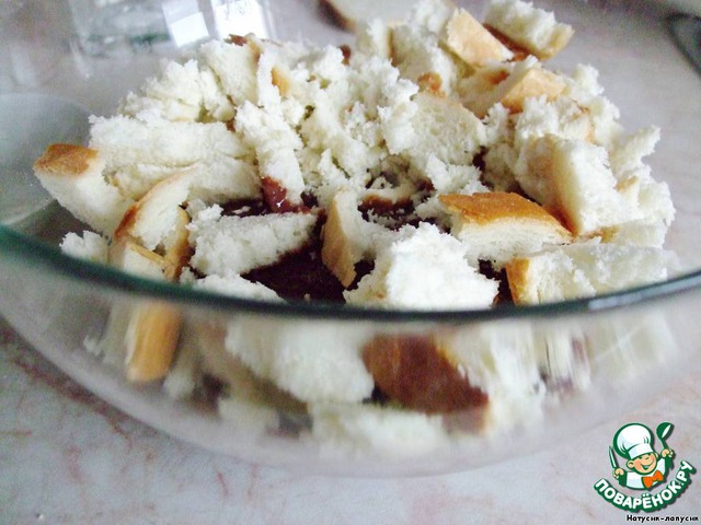 Добавить к печени с луком измельчённый белый хлеб и перемешать. Всё вместе пропустить через мясорубку.