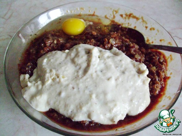 K полученной массе добавить соус, яйцо, соль, перец и тщательно перемешать.