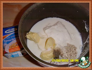 Слова автора. В кастрюлю влить сливки, молоко, положить масло, соль и перец.