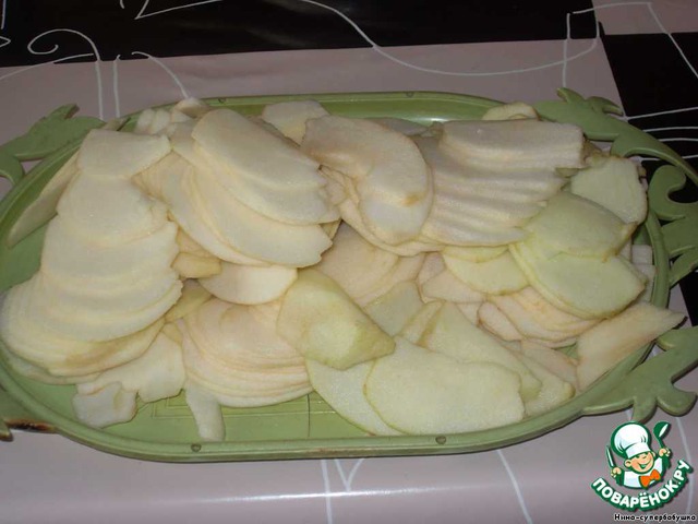 Яблоки очистить и нарезать очень тонкими ломтиками. Можно воспользоваться теркой для чипсов. У меня есть мой любимый Бернер, он решает все проблемы.