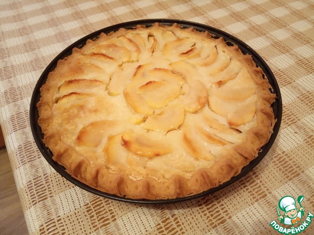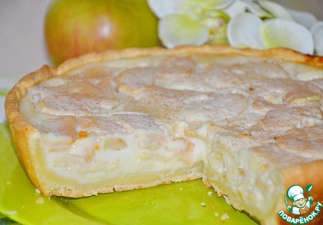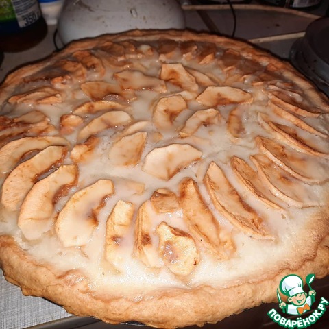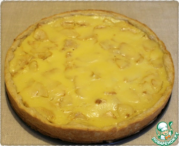Когда все яблоки будут выложены, залить пирог остатками крема и поставить в духовку. Выпекать при 180°С приблизительно 50 минут. Если будет слишком румяниться сверху, прикрыть фольгой, смазанной снизу маслом.