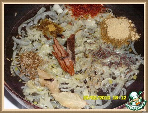 Затем добавить кардамон, гвоздику, корицу, кориандр, паприку, гарам масалу и семена кумина,[i] добавила еще лавровый лист, зерна горчицы. [/i] -