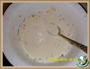 Слегка подогрейте молокo и добавьте шафран, после этого венчиком вмешать крахмал